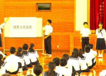 2025.10.6 生徒会 校長室より 全校生 R7年度後期生徒会長選挙立会演説会 令和7年度後期生徒会長選挙の立会演説会が行われました。 立会演説会では、伏木中学校をさらに向上させようと2人の立候補者が力強く演説を行いました。 学習、ボランティア活動、学校全体の絆を強めること等、多岐にわたる分野で、工夫を凝らした様々な取組みを公約として掲げてくれました。とても頼もしく感じました。 演説会の後は、選挙管理委員会が中心となって進められ、厳正な投票が行われました。