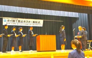 2025.11.4 NEW 全校生 R7年度ポイ捨て禁止ポスター表彰式 「ポイ捨て禁止ポスター」表彰式が伏木コミュニティセンターで行われました。本校からは9人の生徒が選ばれて受賞しました。これは、「明るい社会づくり高岡市民会議」が呼び掛ける運動の一環で行われたものです。現在、受賞作品は伏木コミュニティセンターに展示されています。