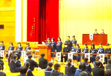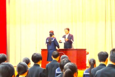 2025.11.4 NEW 生徒会 全校生 R7年度後期生徒総会 令和7年度の後期生徒会がスタートする生徒総会が行われました。 先ず初めに、前期生徒会長が前期を振返り、全校生徒に対して、無事に終えることができたことへの感謝の気持ちが述べられました。次に後期の生徒会長が中心となり、各委員会からの活動計画の発表がありました。厳粛な雰囲気の中、立派な態度でスタートさせることができました。