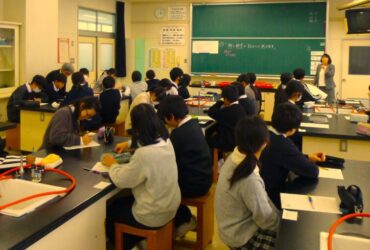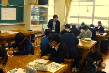 児童は、初めに本校の1年生からの中学校生活に関する説明を聞き、その後、3グループに分かれて実際に中学校の授業を体験しました。